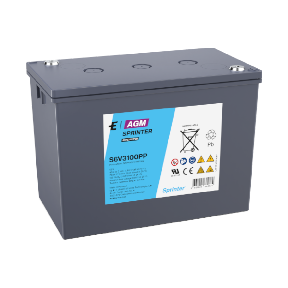 La gama de baterías SPRINTER® PURE POWER SERIES de EXIDE construida con plomo ácido abierta en este caso la Sprinter S6V3100PP, se utiliza sobre todo en aplicaciones industriales, instalaciones solares, telecomunicaciones, sistemas de apoyo y sistemas de emergencia entre otras. Las aplicaciones más habituales son pequeñas plantas de energía fotovoltaica, eólica y segundas residencias.